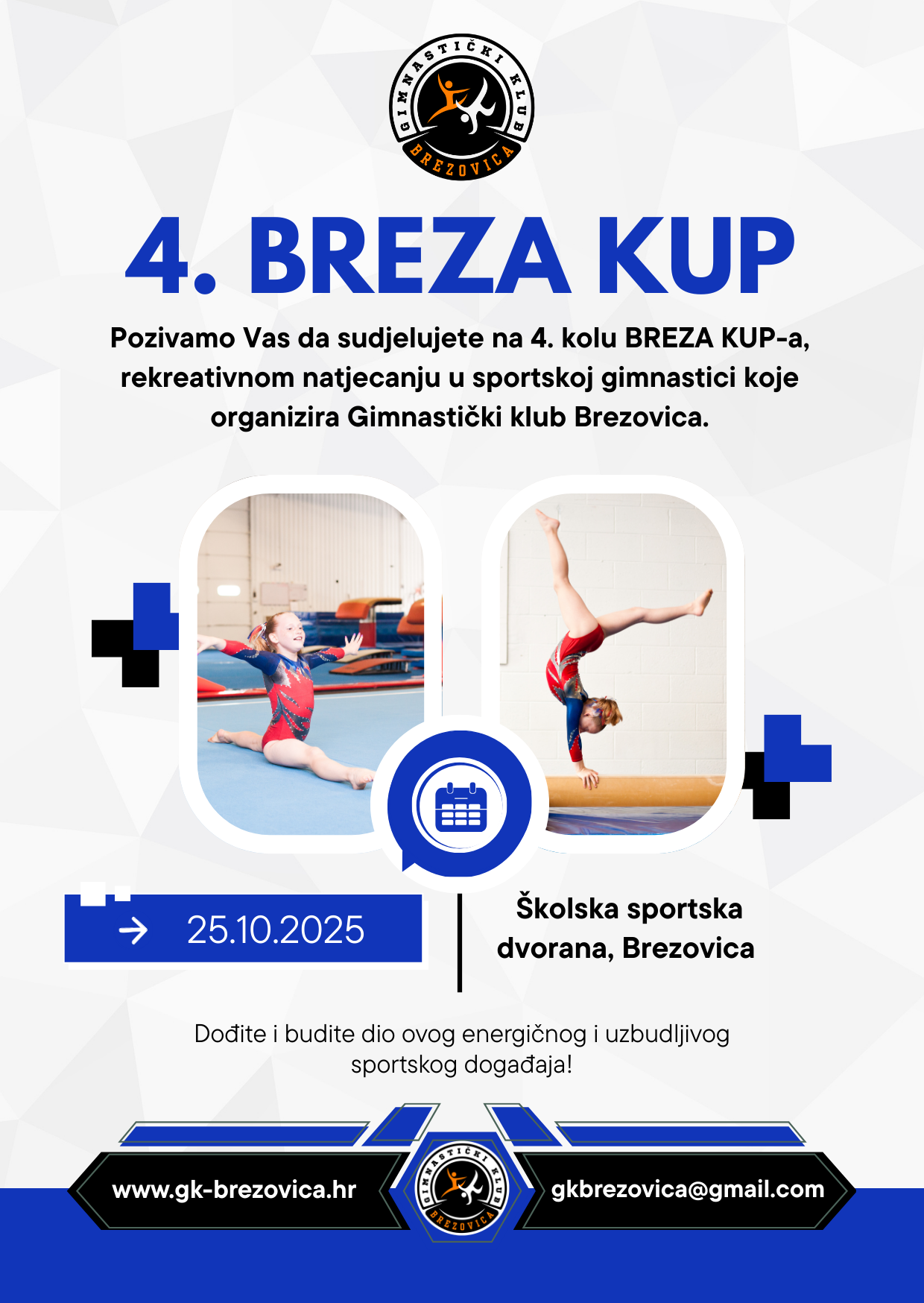 Rekreativno natjecanje u sportskoj gimnastici, koje će se održati u subotu, 25. listopada 2025. godine, u organizaciji GK Brezovica, u školskoj sportskoj dvorani, Brezovica (ulaz u dvoranu na stražnji ulaz iz dvorišta) Brezovička cesta 98a, 10251, Brezovica.